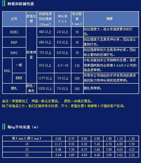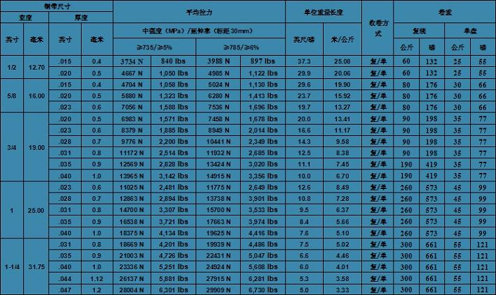 8 平均強度:每種尺寸鋼帶的平均強度都是通過大量試驗數據得出.特殊鋼帶樣品強度可能高于或低于上述強度.